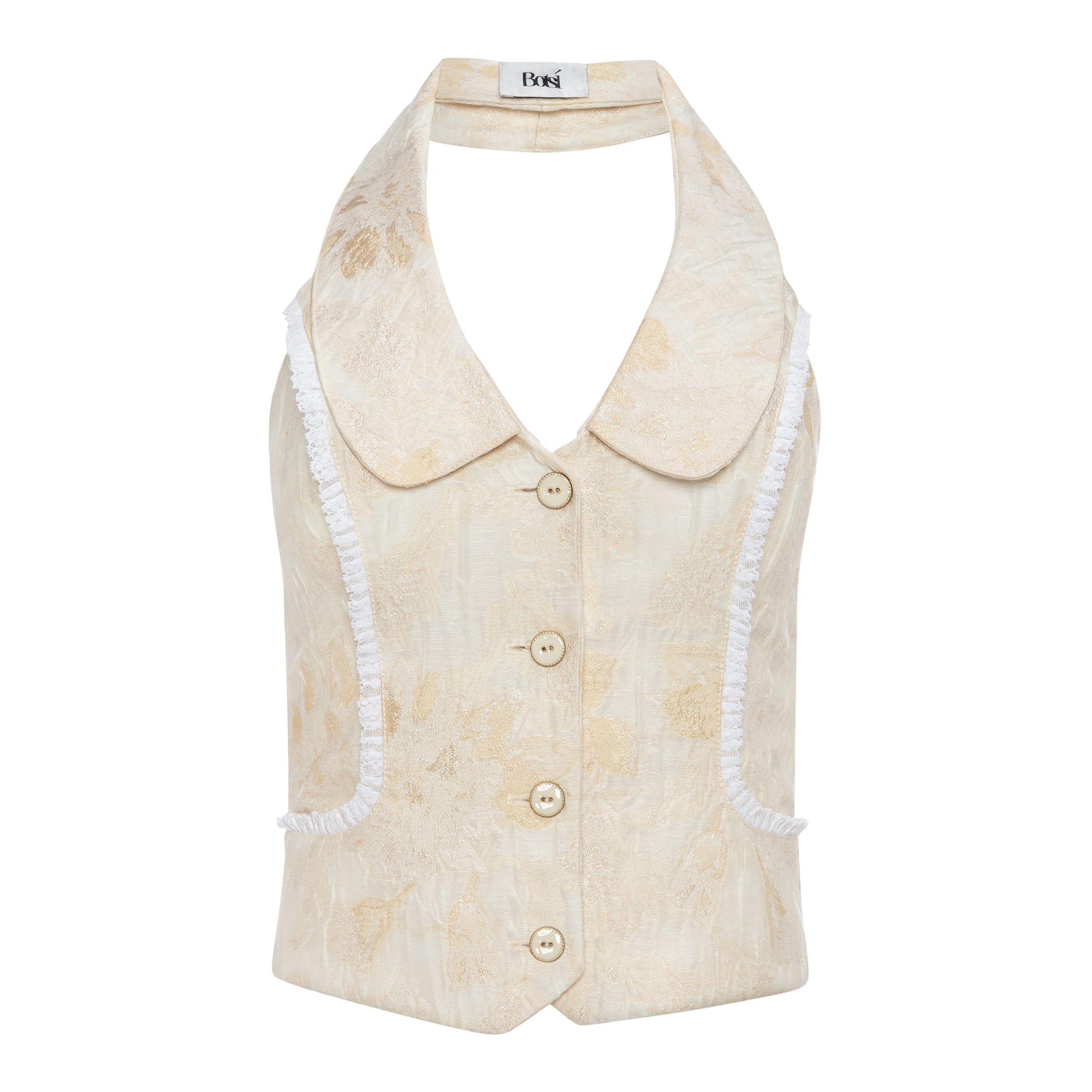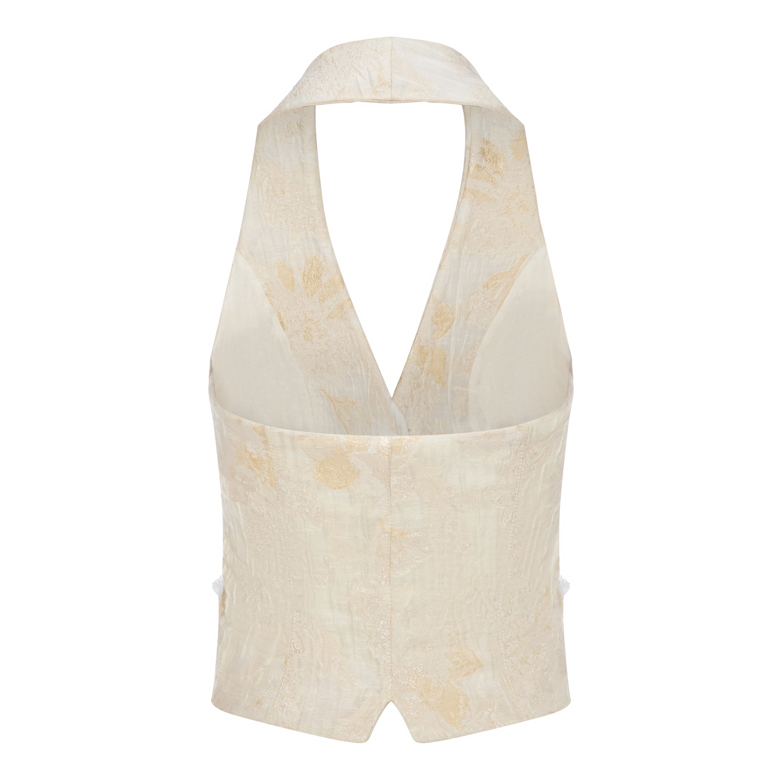 Look no further than the Jacquard Open Back Vest for a blend of vintage charm and a modern touch of character. This vest offers texture and style and is made from a combination of 51% acetate, 30% linen, 13% silk, and 4% other fibers. The open-back design provides an unexpected twist, while the jacquard pattern lends a touch of luxury. The lining is 92% silk and 8% elastane for a soft and comfortable fit. Perfect for layering over a blouse or wearing alone as a statement piece, it is a unique addition to your collection. Made in the UAE, it’s recommended to dry clean this piece to maintain its intricate details.