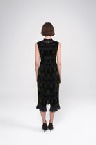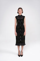 - Features: High Neck with Frill, Plated Top, Midi Length