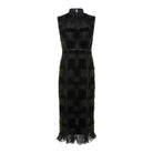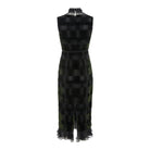 Step into the world of luxury and elegance with the Lace-Panelling Silk Velvet Midi Dress. This stunning piece, available in an elegant olive green and black colorway, is designed to make a sophisticated statement. The high neck with a frill and lace paneling adds a delicate touch to the luxurious velvet fabric, giving the dress a refined yet modern edge. The midi length and fitted silhouette ensure a flattering fit, while the back center zip and hook-and-eye closure offer easy wear. Crafted from a rich blend of viscose, silk, and polyamide, the fabric feels sumptuous against the skin, making this dress as comfortable as it is beautiful.