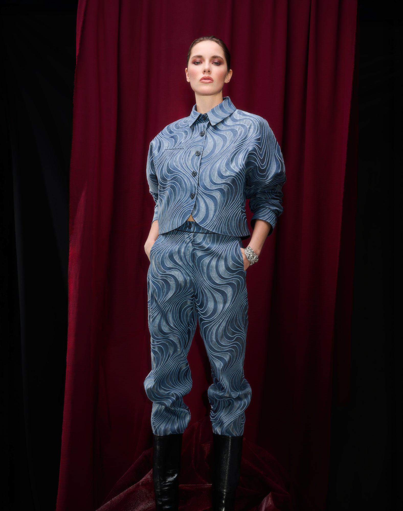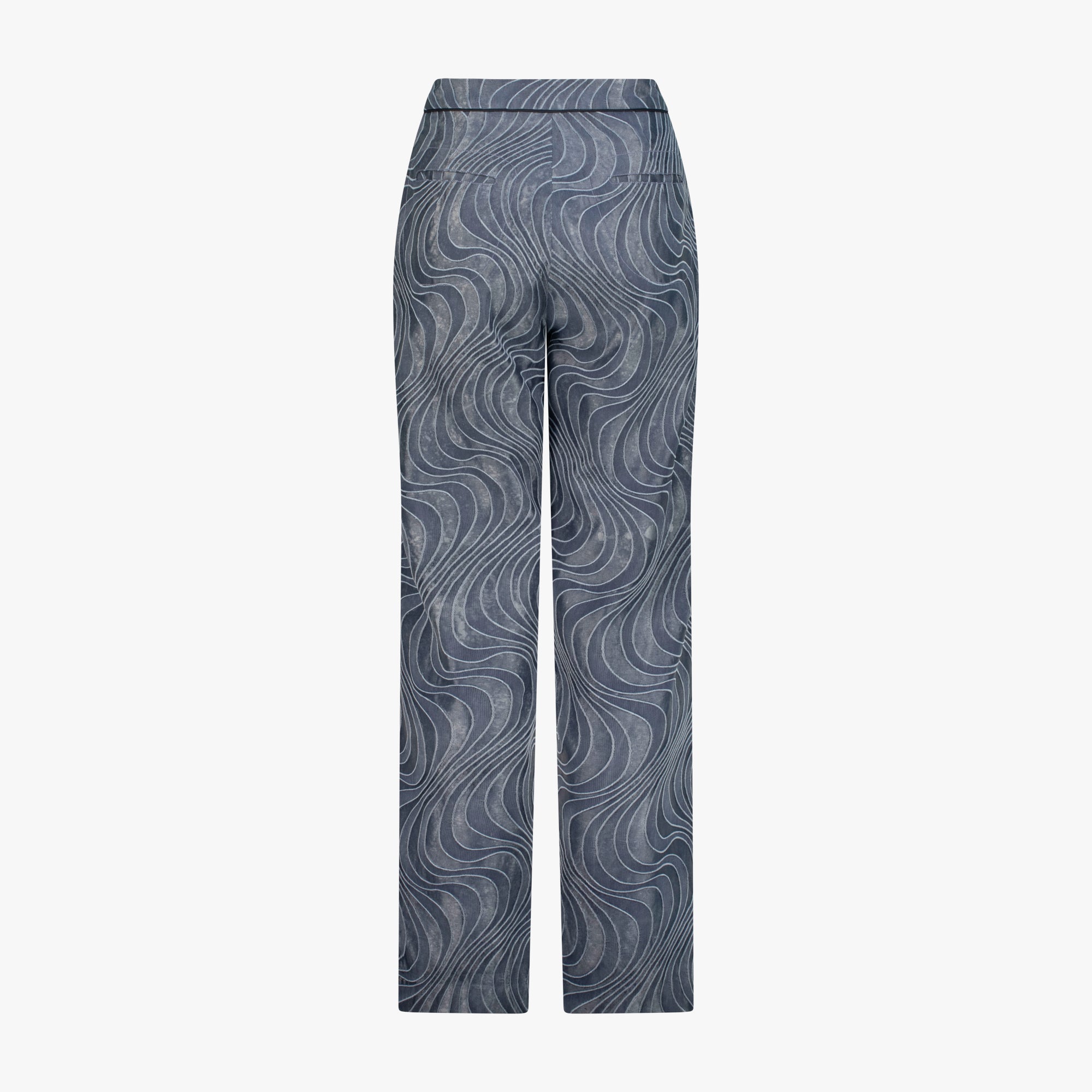 a unique denim illusion with woven wave patterns. The straight-leg silhouette is