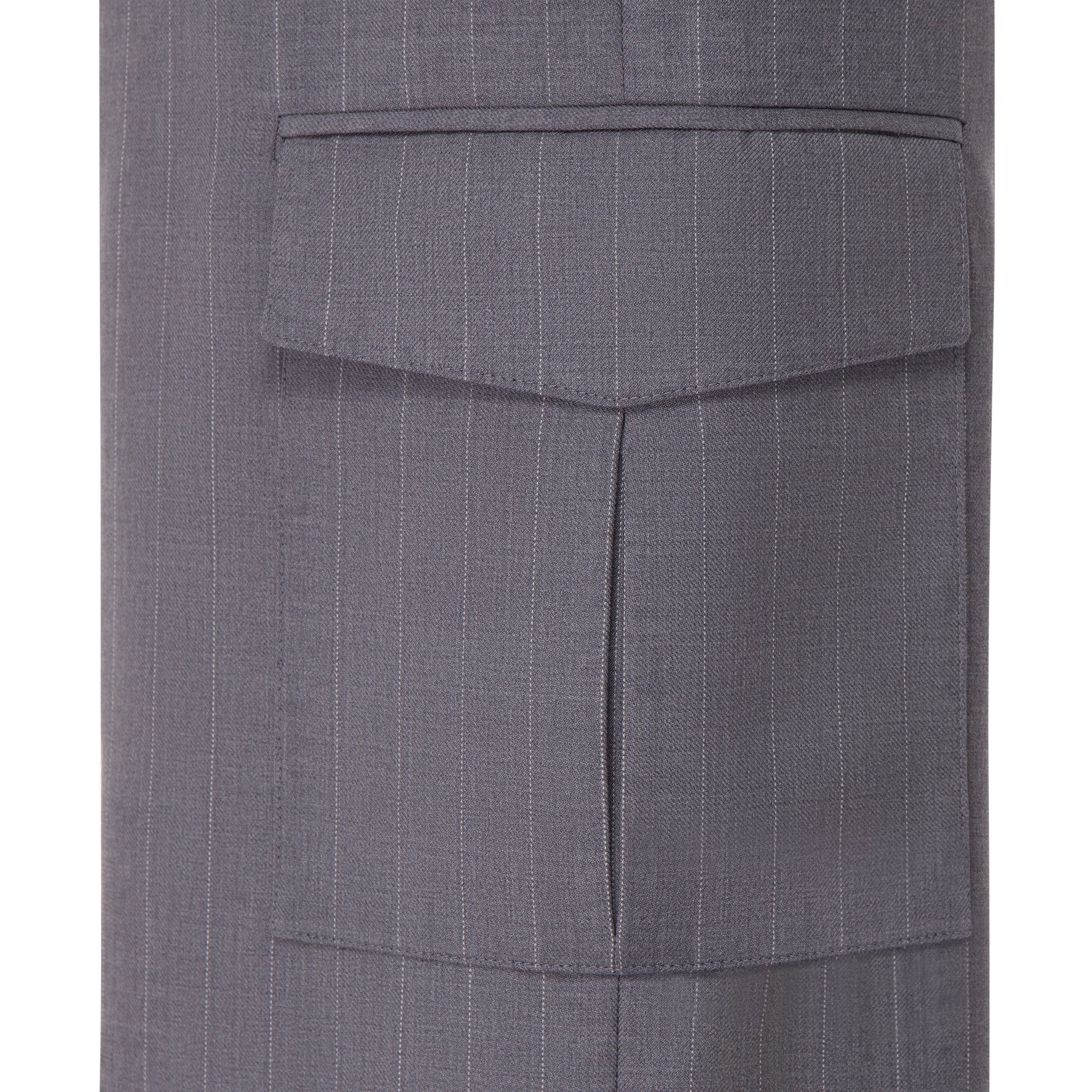 Elevate your style with these gray trousers featuring thin white stripes. Crafted from wool, they boast a high-rise waist, a loose fit through the legs, and convenient side pockets — a sophisticated choice for a polished and comfortable look.